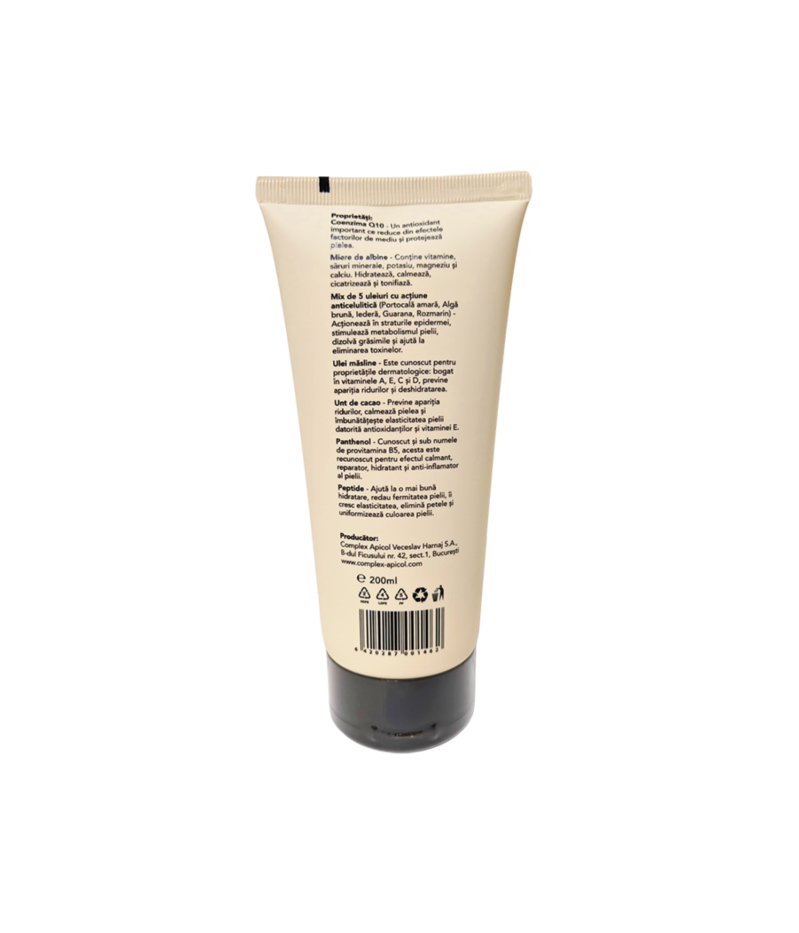 Mix de 5 uleiuri cu acțiune anticelulitică (Portocală amară, Algă brună, Iederă, Guarana, Rozmarin) - Acționează în straturile epidermei, stimulează metabolismul pielii, dizolvă grăsimile și ajută la eliminarea toxinelor.