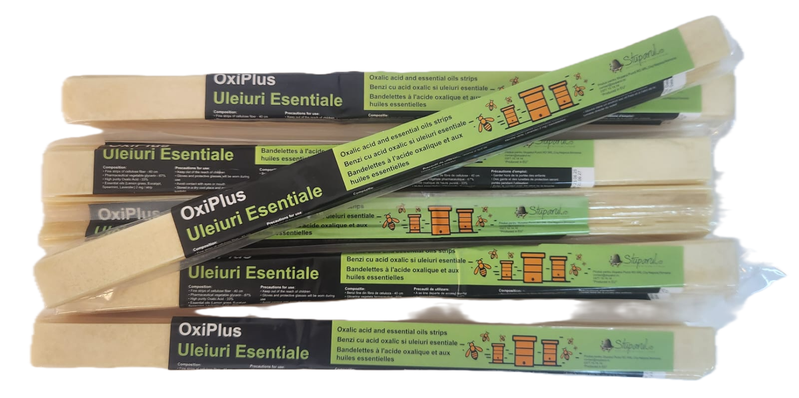 OxiPlus Uleiuri Esentiale - Benzi acid oxalic si uleiuri esentiale actioneaza continuu, prin contact, pe o perioada de aproximativ 3 saptamani, reducand infestarea cu Varroa cu peste 95%. Datorita uleiurilor esentiale atractante din compozitia lor (vezi sectiunile Compozitie si Efectele uleiurilor esentiale folosite pentru mai multe detalii) albinele sunt stimulate sa intre mai mult in contact cu aceste benzi (sa le roada) raspandind mai repede substanta activa (acid oxalic) pe suprafata a mai multor albine, mai repede. Recomandam folosirea acestei variante OxiPlus la familii mai slabe sau la roi, care de obicei rod mai greu benzile sau in cazul infestarilor mai mari cand se doreste o actiune mai puternica, mai repede. De tinut cont insa ca in cazul infestarilor puternice familia poate suferi si din cauza virusurilor transmise de Varroa (Virusul aripilor deformate - fiind doar unul dintre ele) si regresul familiei poate continua si dupa eliminarea infestarii cu Varroa.